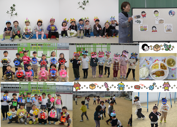 2月3日 保育所で豆まきをしました。みんなで、「豆まき」の歌や「鬼のパンツ」の手遊びをした後、節分の由来についてのペープサートを見ました。その後新聞で丸めた豆で交代をしながら豆まきをしました。お昼の給食のイワシも「美味し・・」と、お代わりして食べていました。心も体も元気いっぱいになりました。今年もみんなの所に沢山の福がきますように・・・