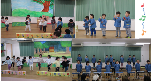 2月7日 一年の締めくくりとして発表会をしました。沢山の人の前で緊張した子もいましたが、みんな頑張って楽器あそびや、お話遊びをしました。保護者の方の温かい拍手が力となりました。ありがとうございました。
