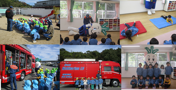 11月4日 消防署の方に来ていただき防火教室をしました。避難訓練を見てもらった後、大根の大ちゃんに着衣着火した時の対応の仕方を実際に体験しながら教えて頂きました。けむり体験や消防車両の見学をしました。普段から訓練をし、もしもの時に備えたいと思います。