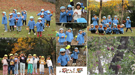 11月12日 3・4歳児が秋見付けをしにスポーツセンターに行きました。「どんぐり見つけた。」「黄色い葉っぱがあった・・・」「あけびがたくさんなっている!」など見付けたものを友だちと楽しんでいました。