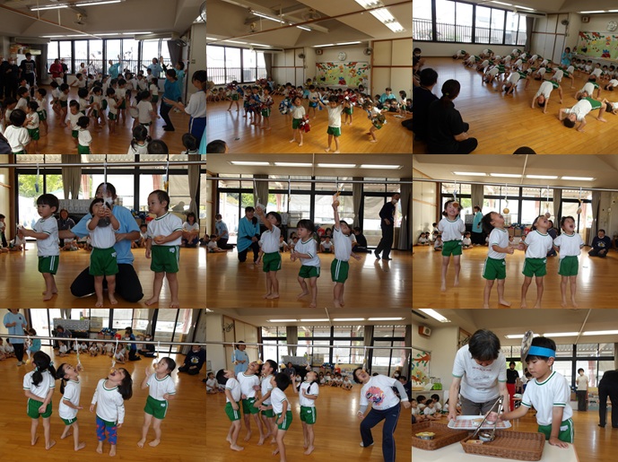 10月15日 野々草園の利用者さんと高年クラブの方とミニ運動会をしました。子どもたちは楽々会でしたダンスや組体操を見てもらいました。また、みんなでパン食い競争をしたり、Mr.ドーナツのゲームあそびをしたりして楽しい時間を過ごすことができました。