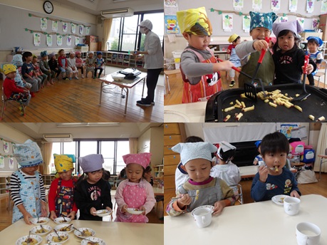 10月22日 今月のクッキングは3歳児がさつま芋スティックを作りました。給食室で蒸かしてもらったさつま芋をホットプレートで焼いて、仕上げに砂糖をまぶしました。自分たちで料理して食べる体験をした子どもたちはいつも以上においしく感じたようです。