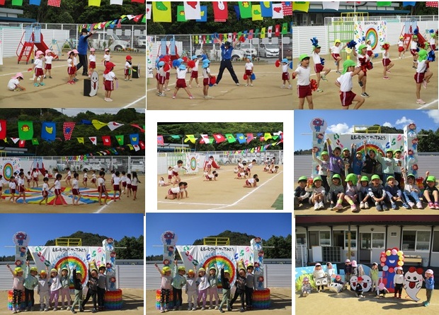 運動会を開催しました。今年度は《未来に向かってやってみよう》をテーマに取り組みました。りす・うさぎ・ぱんだ組が1部。きりん・らいおん組が2部。らいおん組が1部2部のオープニングで「やってみよう」のダンスを披露しました。運動会では、保護者の方々の応援もあり、元気いっぱいの子どもたちでした。