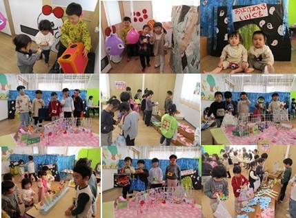 子ども、保育士手作りのお店屋さんごっこをしました。お店は《ごはん屋さん》《スイーツ屋さん》《おしゃれ屋さん》《おもちゃ屋さん》《おばけめいろ》です。うさぎ組は吹き戻しやカメラが人気、ぱんだ組はのびる剣、きりん・らいおん組はおばけめいろでした。お店屋さん役のらいおん組は、お金のやり取りも上手にできました。