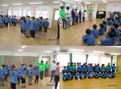 相生保育所、矢野川保育所の5歳児らいおん組が、地域の梅鶯会の方々と交流会をしました。今年度2回目なので、和やかな雰囲気の中、けん玉を披露し合ったり、ふれあいあそびを楽しんだりしました。
