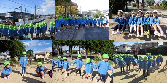 秋晴れのとてもお天気の良い日に、大きなクラスのお友だちが小さなクラスのお友だちの手をつないで、スポーツセンターセンター駐車場まで秋を探しに行きました。落ち葉や木の実を拾ったり、カマキリを見つけて、怖くて触れず、観察したりしました。