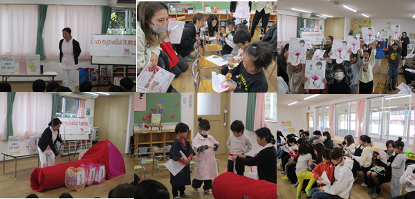 11月12日 5歳児が親子でいのちの授業に参加しました。助産師さんの前田先生に来ていただき5歳児がいのちの授業を受けました。生命誕生について学び、命の大切さに触れる時間を親子で過ごしました。胎盤や胎盤を実際に製作したり、クラスのみんなに見守られながら産道体験をしました。また、保護者の方から子どもたち一人ずつの名前の由来を聞かせて頂きました。「この世に生まれてきてくれてありがとう。」この大切な命を守りながら、一人ひとりを大切にし、これかも元気に育って欲しいです。