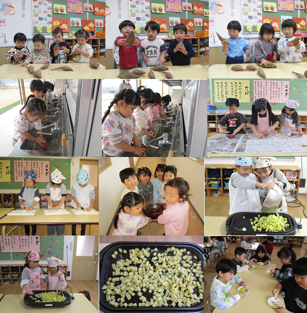 11月19日 保育所で植えたさつま芋は今年は残念ながら収穫できませんでした。購入したさつま芋を使用し、「サイコロ大学芋」のクッキングをしまた。3歳児が芋を洗う・4歳児はピューラーで皮むき・5歳児が包丁で角切りしました。それを調理場で茹でてもらい、4・5歳児がホットプレートで焼き目を付けてくれました。バターやお砂糖で味付けをしました。焼きたての芋はホクホクでした。みんなで美味しく頂きました。