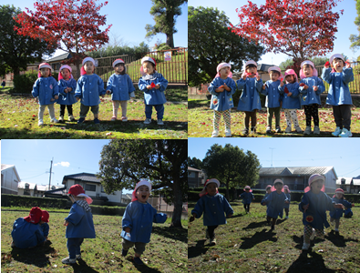 11月12日 3・4歳児が秋見付けをしにスポーツセンターに行きました。「どんぐり見つけた。」「黄色い葉っぱがあった・・・」「あけびがたくさんなっている!」など見付けたものを友だちと楽しんでいました。
