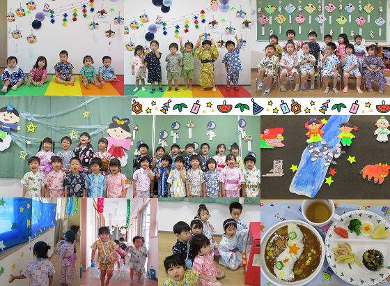 7月7日 七夕会をしました。みんなで一緒に「たなばたさま」「おほしさま」を歌った後、1・2歳児は手遊び、3歳児はカスタ奏・4歳児ハンドベル、5歳児は鍵盤ハーモニカの演奏を披露しました。七夕の由来のブラックシアターを見た後はみんなが楽しみにしていた模擬店。ほし見つけ、さかなとり、天の川ジャンプにチャレンジしお土産をもらいました。お昼は七夕カレー・おやつは星のフルーツポンチをいただきました。
