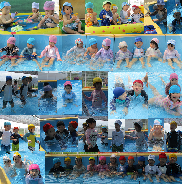 7月9日 プール遊びが始まりました。1・2歳児は、恐竜のビニールプール、3・4・5歳児は園庭に設置したプールに入って楽しんでいます。最初は顔に水がかかるのを嫌がっていましたが、慣れてくるとワニさんになったり水の掛け合いをして楽しんでいます。プール遊びは8月の上旬まで楽しみたいと思います。