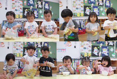 8月8日 クラッシュバナナづくりに挑戦しました。バナナをジッパーに入れバナナをつぶしました。「むにゅ むにゅする・・・」と言いながら楽しんでしていました。そこへ牛乳を入れました。「バナナジュース冷たくて美味しい。」と喜んで食べていました。