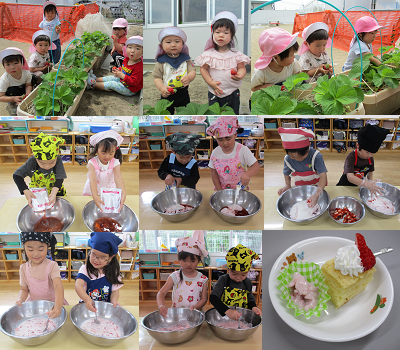 5月16日 1・2歳児が収穫したいちごを使い、4歳児が「いちごたっぷりフルーチェ」を作ってくれました。今年初めてのクッキングでエプロンを付けるだけでウキウキの子どもたち。材料を慎重にボールに入れ上手に混ぜてくれました。「家でも作りたい。」「簡単にできた。」など大喜びでした。