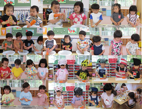 保育所で収穫した玉葱を使いカレーを作りました。1・2歳児は、人参やじゃが芋洗い、3歳児は玉葱の皮むき、4歳児はピューラーで皮むき5歳児は食べやすい大きさに包丁で切りました。調理室で炊いてもらい、給食に出してもらいました。みんなで作ったカレーは「おいしー」「おかわりする」と喜んで食べていました。
