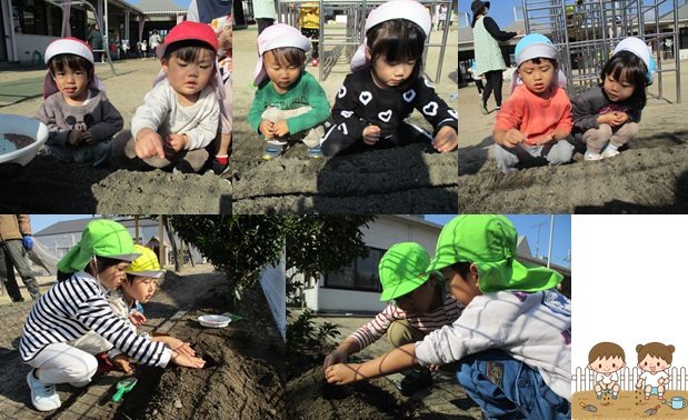 11月7日 きぬさやの種とはつか大根の種を植えました。土に穴を少し掘って小さい種をそっと入れて優しく土をかけました。小さい手で一生懸命つまんで、みんな上手に楽しく種植えができました。