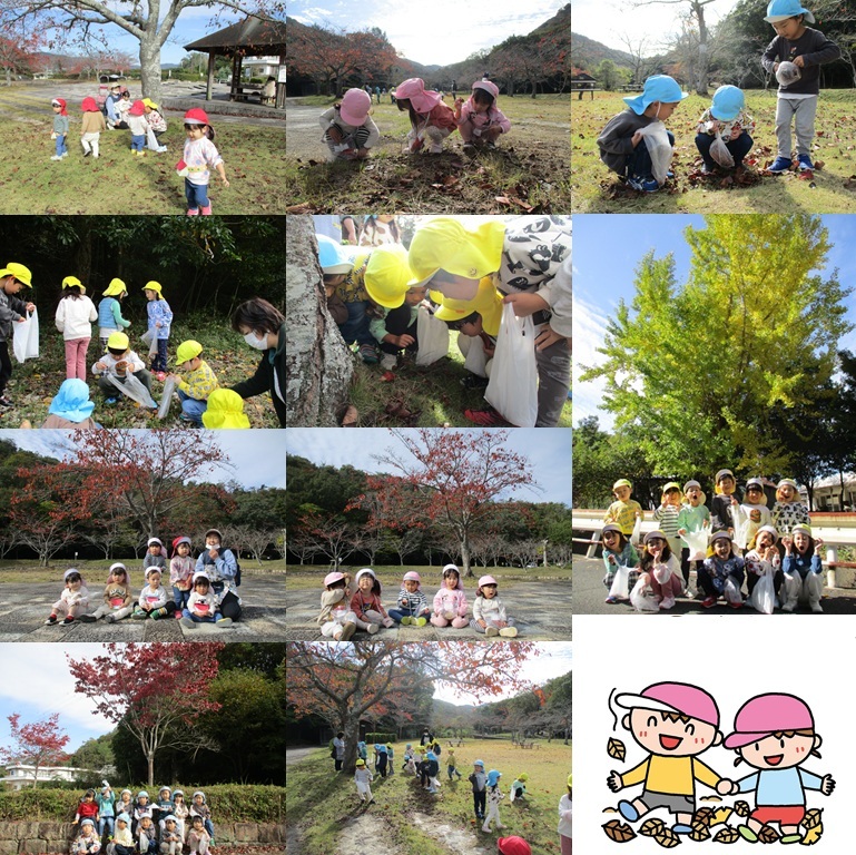 11月11日 1〜4歳児は岩屋谷公園や保育所裏の山のふもとへ秋みつけへ出かけました。どんぐりや赤やオレンジの葉っぱを見つけて大喜び!「先生、見つけた〜!」と、子どもたちの嬉しそうな声がたくさん聞こえました。この日は4歳児が一番大きいお兄ちゃん・お姉ちゃんだったので、どの子も優しく年下のお友だちに接してくれていました。