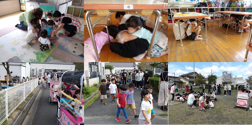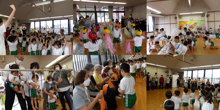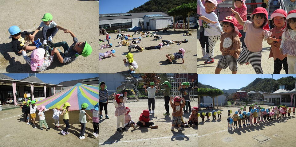 | 10月5日、楽々会をしました。コロナ渦からは二部に分かれて行っていましたが、久しぶりに全児と保護者が集まり賑やかに過ごしました。心配していたお天気も無事に晴れ、青空の下で力一杯頑張っていた子どもたちです。セレモニーでは4・5歳児のパラバルーンの演技の最後に2・3歳児も参加し、大きな拍手をもらいました。親子競技ではご家族と触れ合い、かけっこやリレー、ダンスや組体操では自分の力を発揮して頑張る姿を見てもらい、帰る時の子どもの表情はどの子も活き活きしていました。ご参加くださった保護者のみなさまもありがとうございました。 |