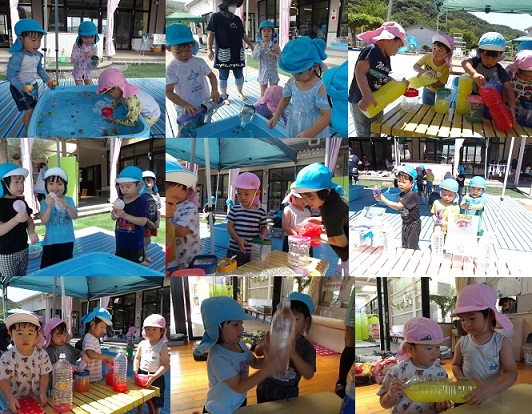 | 9月18日、園庭で栽培していた枝豆を1歳児さんが収穫してくれました。最初は恐る恐る近づく子どもたちでしたが、平気だとわかるとプチプチちぎって採ってくれました。中には気に入ってその後もずっと握ったまま話さない子もいましたよ。給食の先生に柔らかく湯がいてもらい、午睡後のおやつの時間に自分でつぶしてクラッカーにはさんで食べました。2歳児さんからは自分でさやから出して作りました。さやからプッと飛び出るのが面白くてたくさん押し出していました。味もクラッカーのほどよい塩気と合わさり美味しかったようで大好評でした。 |