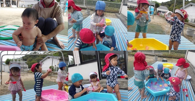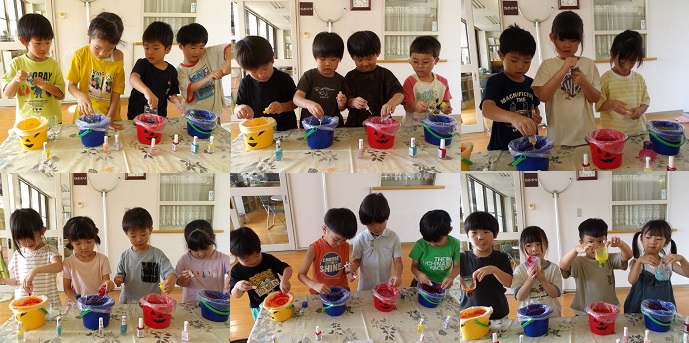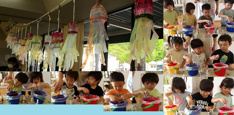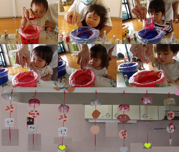 りす組のお友だちが、マニュキアを水面に落として模様を作り、ペットボトルに色を付け、風鈴を作りました。