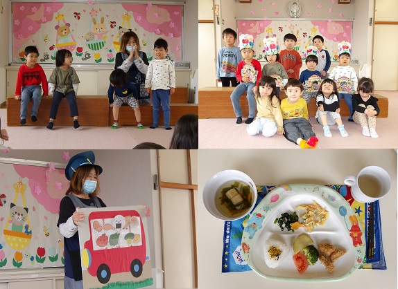 4月18日、4月生まれの友だちの誕生会をしました。今年からコロナ渦前のようにみんなで遊戯室でお祝いすることになり、初めてたくさんの友だちの前に立った誕生月の子どもたちは少しドキドキしていましたが、頑張って名前や年齢を自分で言ったり、友だちの質問に答えたりしていましたよ。担当の先生からは「はしれ!おべんとうバス」のボードシアターを見せてもらいました。