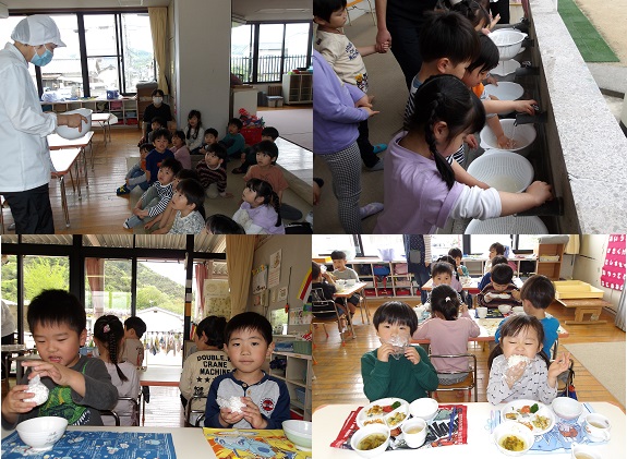 4月23日、給食で食べるお米を4・5歳児が研ぎました。給食の先生に研ぎ方を教えてもらって順番に挑戦しましたよ。お水が白くなるのを不思議がったり、お米の硬さに驚いたりと、反応もいろいろな子どもたちでした。炊きあがったご飯を自分で握っておにぎりにして食べると、「やわらかいなぁ」「アツアツや!」「星の形にしよー」と楽しみながら作り、あっという間に食べていました。