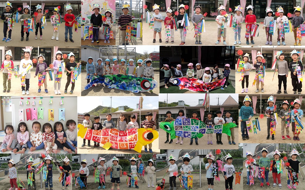 今年も各クラスごとにこいのぼりを作りました。絵の具や色紙を使って、色とりどりのこいのぼりができました。また、2〜5歳児は大きなこいのぼりもクラスごとに作って、岩屋谷公園のこいのぼりの谷渡しに参加しました。