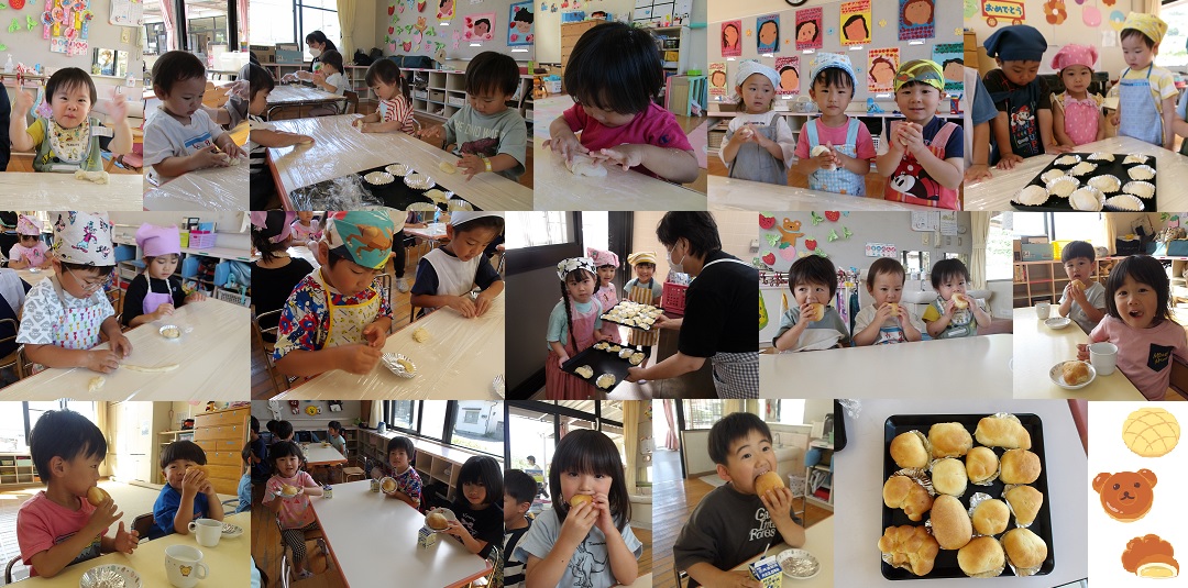 6月5日 全クラスでパン作りをしました。1・2歳児は不思議そうに生地を触り感触を楽しんでいました。3歳児は丸めたりのばしたりしながら思い思いにパン作りを楽しんでいました。4・5歳児は作りたい形を考え、きのこパンやうさぎパン、ミャクミャクなどを作り、自分だけのオリジナルパンが完成していました。