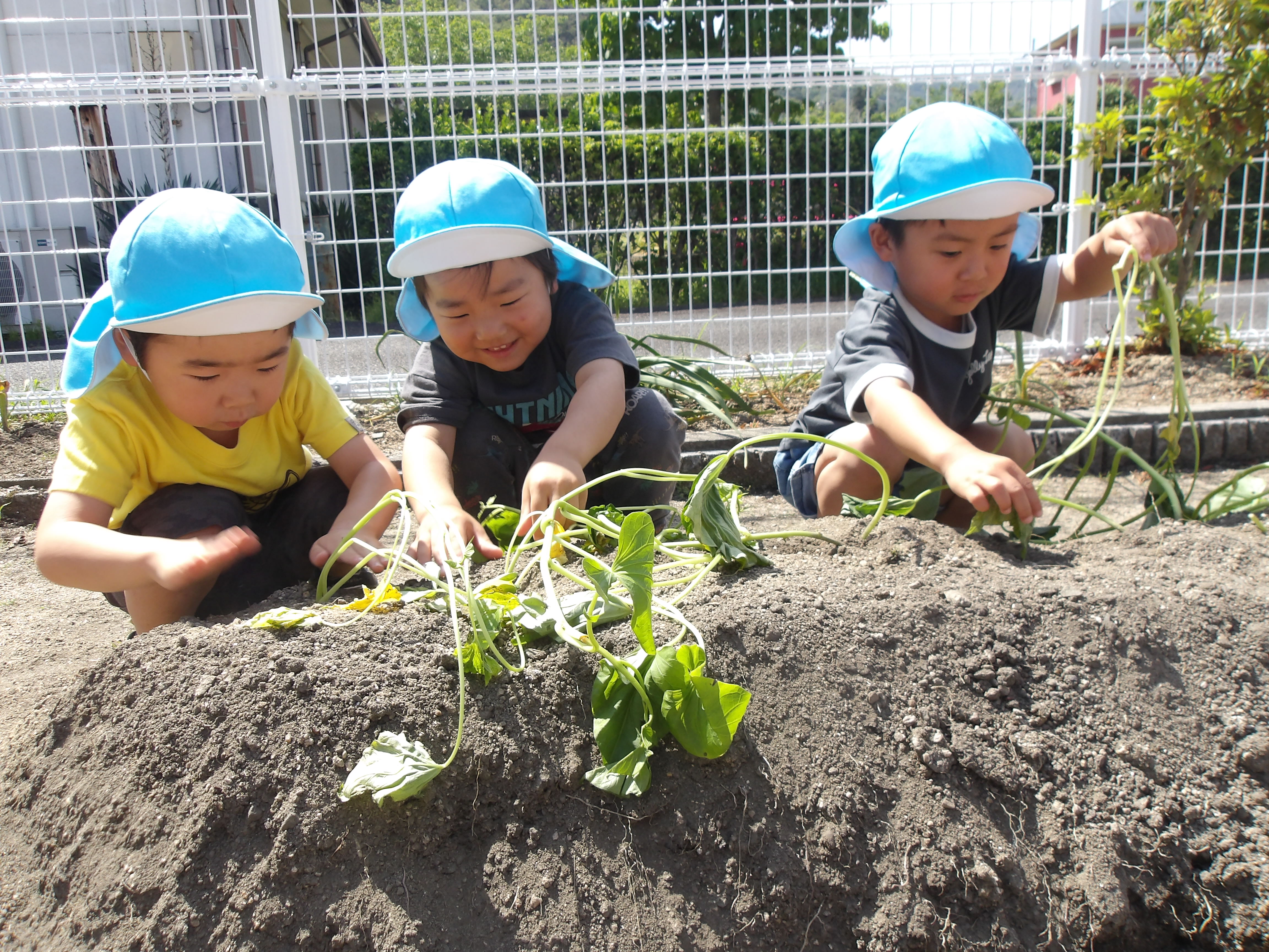 6月6日 さつまいもの苗を植えました。用務員さんに植えかたを教えてもらうと、穴を掘って優しく土の布団をかけて「大きくな〜れ!」と言いながらニコニコ笑顔で苗を見つめる子どもたちでした。秋の収穫がとても楽しみです。