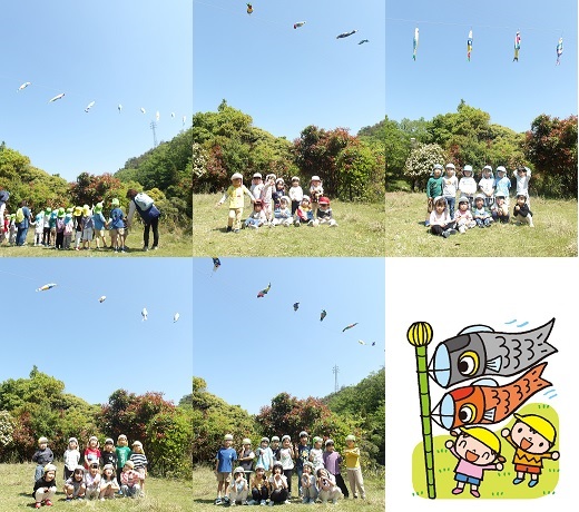 5月13日 みんなで岩屋谷公園へこいのぼりの谷渡しを見に行きました。たくさん泳いでいるこいのぼりのなかから自分たちが作ったこいのぼりを見つけると大喜びの子どもたちでした。