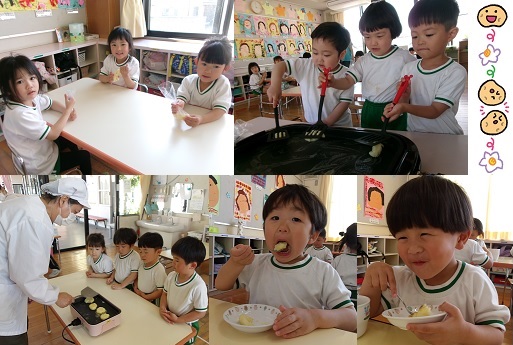 5月14日 3〜5歳児がじゃがいものおやきを作りました。給食の先生が茹でてくれたじゃがいもをビニール袋でつぶしてホットプレートで焼きました。ホットプレートで焼いている時には「おいしそう匂いがしてきた!」と、出来上がりを楽しみにしていた子どもたちでした。4・5歳児は自分で焼くことにもチャレンジしました。