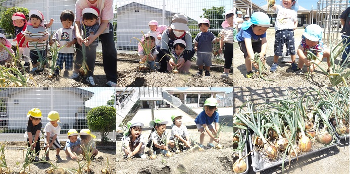 6月4日 全員で玉ねぎの収穫をしました。「大きくなってきている!」と、収穫するのを楽しみにしていた子どもたち。みんなで力を合わせてたくさんの玉ねぎを収穫しました。収穫した玉ねぎは給食でいただきます。