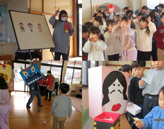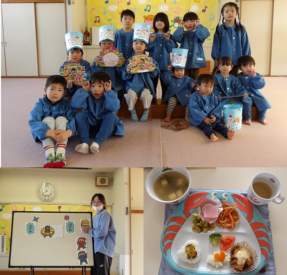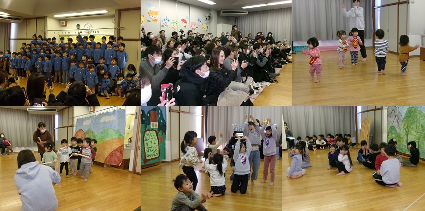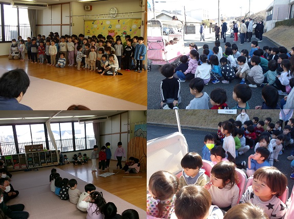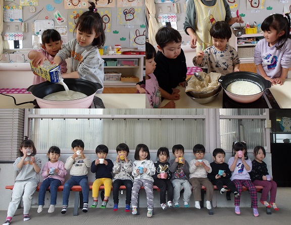 | 2月21日、今回のクッキングは3歳児が大活躍でカッテージチーズを作りました。鍋に牛乳を入れ火にかけてかき混ぜながら温め、酢を入れて分離させると出来上がり。ガーゼでこしてホエイとチーズに分ける所は2歳児も飛び入り参加で頑張りました。ホエイは栄養もたっぷりで調味料を入れるとカルピスのような味になるので、3歳児は味見してみました。「おいしい!」とおかわりする子もいれば「むり〜」と顔をしかめる子もいました。できたチーズは給食の「ポテトのチーズ焼き」の上に乗せてオーブンで焼いてもらい、みんなで食べました。 |
