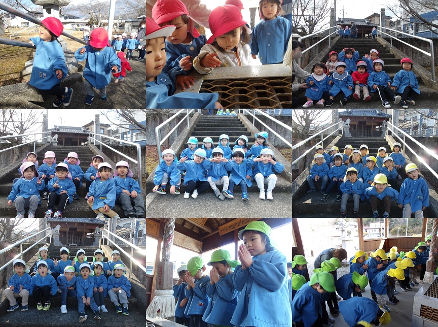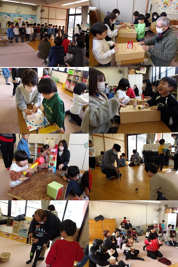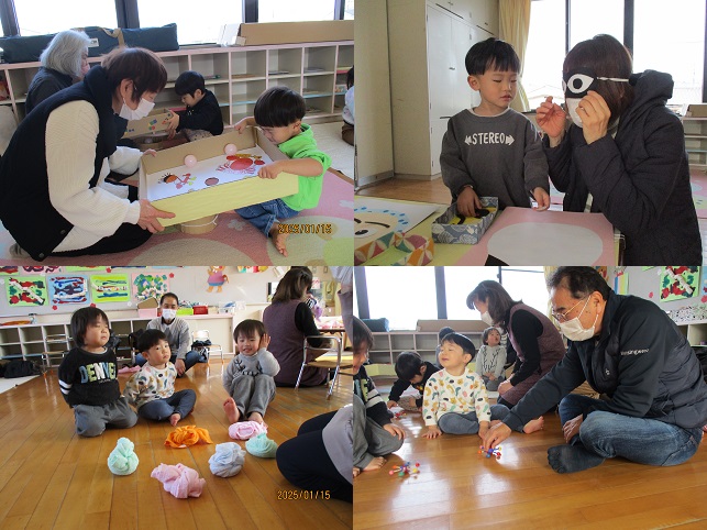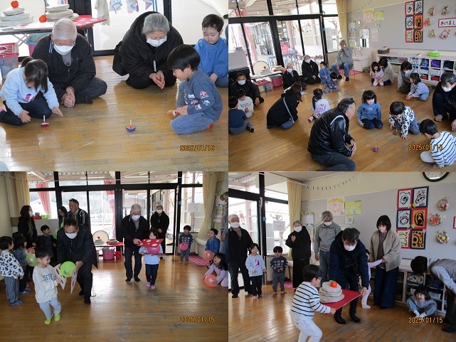 1月15日、おじいさん、おばあさんと一緒にお正月あそびを楽しみました。各クラスに分かれて、それぞれの年齢に応じたあそびをして遊んだり、季節の歌を歌っている所を見ていただいたりして過ごしました。たくさんご参加くださり、また、お孫さんだけでなくまわりの子どもたちとも一緒に過ごしてくださりありがとうございました。