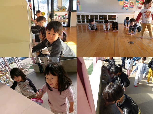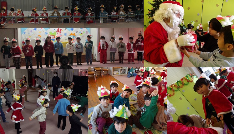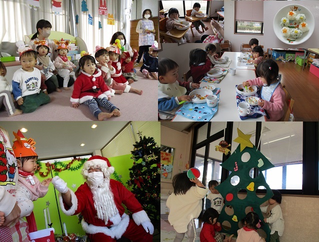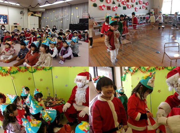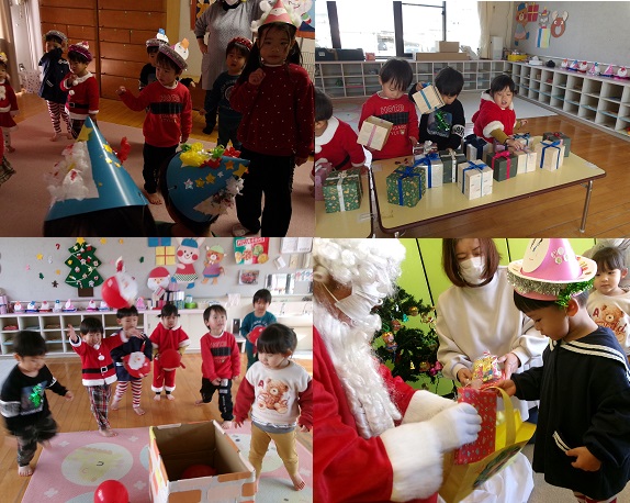 遊戯室ではみんなの前で4歳児さんは鍵盤ハーモニカ、5歳児さんはハンドベルを披露しました。練習の成果を友だちに見てもらって、やり遂げた満足感が滲み出ていました。サンタさんとの対面はワクワクが隠し切れない様子の子どもたちでしたよ。質問もたくさんしてサンタさんに答えてもらい「へ〜」「そうなんや」と反応しながら聞いていました。部屋ではクリスマスクイズやグループごとにゲームを楽しみました。