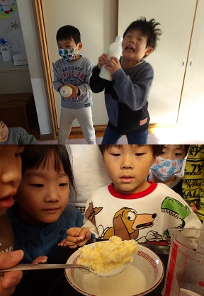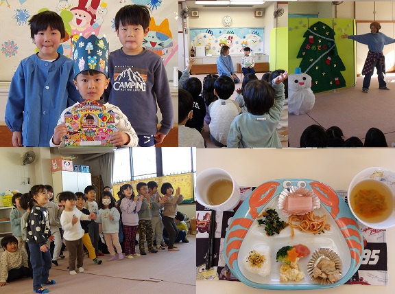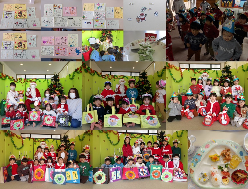 | 12月24日、クリスマス会をしました。サンタさんに「来てね!」とお手紙を出していたのですが前日に返事が届き、昨日からワクワクしていた子どもたち。朝からちびっこサンタさんやオシャレさんが次々と登所し、一気に賑やかな雰囲気になりました。みんなで遊戯室に集まりクリスマスの歌を歌ったりダンスをしたりお話を聞いたりして、部屋に戻る時にサンタクロースの部屋にサンタさんが座っていることに気付いた子どもたちが大騒ぎ!0・1歳児さんから順にサンタクロースの部屋でお話したりプレゼントをもらったりして楽しい時間を過ごしました。 |