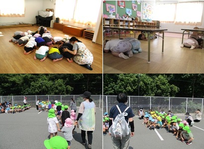 相生保育所と合同で地震訓練をしました。地震発生の呼びかけで、机の下や部屋の真ん中に集まり頭を隠して小さくなったりしました。帽子をかぶり、しっかりと靴を履いて、静かに避難場所まで逃げました。