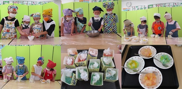 らいおん組がひんやりゼリーを作りました。ゼラチンを作り、好きな果物と一緒に容器に入れました。次に、シロップのいちごかブルーハワイの味を選んで容器に入れ冷蔵庫で冷やしました。赤や青のきれいな色のゼリーが出来上がりました。