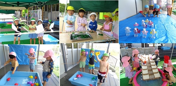 「的あて」「感触あそび」「氷ボーリング」「風船魚つり」「魚のウォータースライダー」5つのコーナーを楽しみました。感触あそびは、「気持ち悪いけど、気持ちいい」などと、友だちと話しながら楽しみました。