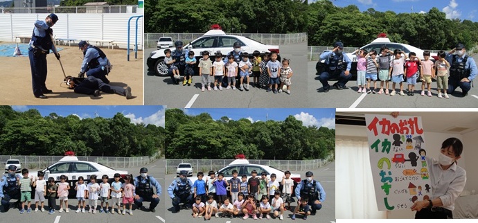 相生警察署の方に来ていただいて、不審者侵入想定の訓練やパトカーとの記念写真撮影、警察官の方によるお話や紙芝居などを見せてもらい、命の大切さを教えていただきました。