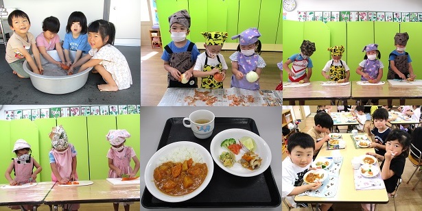 ぱんだ・きりん・らいおん組がカレー作りをしました。ぱんだ組は野菜を洗いました。きりん組は野菜の皮を手やピーラーでむきました。らいおん組は包丁を使って野菜を切りました。後は、調理さんにお任せ。みんなで力を合わせて作ったカレーはとてもおいしかったです。