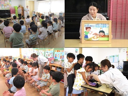 赤穂健康福祉事務所(食品薬務衛生課)の方に、きりん・らいおん組を対象に手洗い教室を実施していただきました。紙芝居「れん君とあわりぃの手洗い大冒険」を見て、正しい手洗いを教えていただき、手洗いチェッカー使って洗い残しを可視化して確認したりしました。少しの時間でしたが、正しい手洗いをすることの大切さを学ぶことができました。