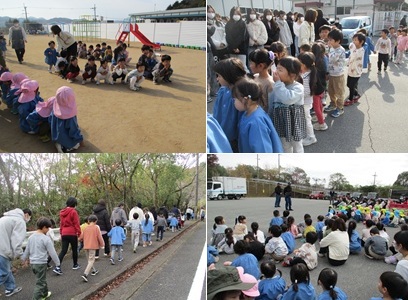 相生保育所、看護専門学校と合同で避難訓練をしました。保育所からスポーツセンター駐車場までは、学生さんが子どもたちの手をつないでくれたり、避難車を押してくれたりしました。消防士さんからも「上手に避難することができました。」と言っていただきました。