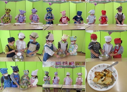 きりん・らいおん組が【さつまいもとチーズのスティックパイ】を作りました。いろいろな工程をみんなで協力したり、分担したりしてさつまいも餡を作りました。らいおん組はパイ生地をめん棒で伸ばして、パイ包みも自分でしました。自分たちで作ったパイはとてもおいしかったようです。