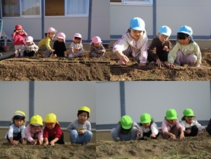 細い玉ねぎの苗を慎重に持って、支援員さんに植え方を教えてもらいながら植えました。春に大きな玉ねぎが収穫できるよう、みんなで水やりをします。