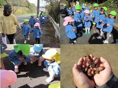 秋晴れのとてもお天気の良い日に、大きなクラスのお友だちが小さなクラスのお友だちの手をつないで、スポーツセンターセンター駐車場まで秋を探しに行きました。落ち葉や木の実を拾ったり、カマキリを見つけて、怖くて触れず、観察したりしました。